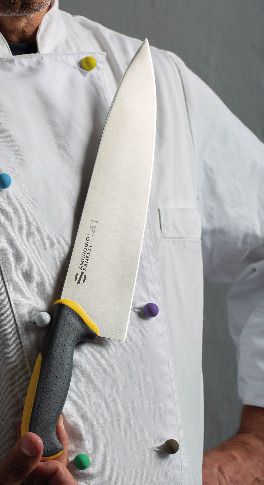 This new handle has a PP core, strongly connected with the stainless steel, coated with a thick layer of a softer SEBS. The two parts are moulded together to form a perfectly solid handle and the external grey layer has ergonomic protruding dots to enhance anti-slip properties, for the maximum comfort and efficiency.