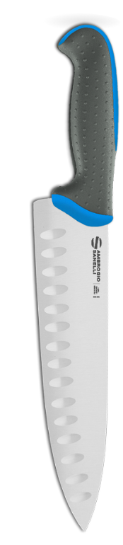 Innovative range of professional knives with handles made of two different materials and blades manufactured with special NITRO-B stainless steel with nitrogen (1.4916). This new handle has a PP core, strongly connected with the stainless steel, coated with a thick layer of a softer SEBS. The two parts are moulded together to form a perfectly solid handle and the external grey layer has ergonomic protruding dots to enhance anti-slip properties, for the maximum comfort and efficiency. All materials are non-toxic, sterilizable, dishwasher safe, resistant to high and low temperatures and complying with the most updated EU regulations for items intended to be in contact with food.